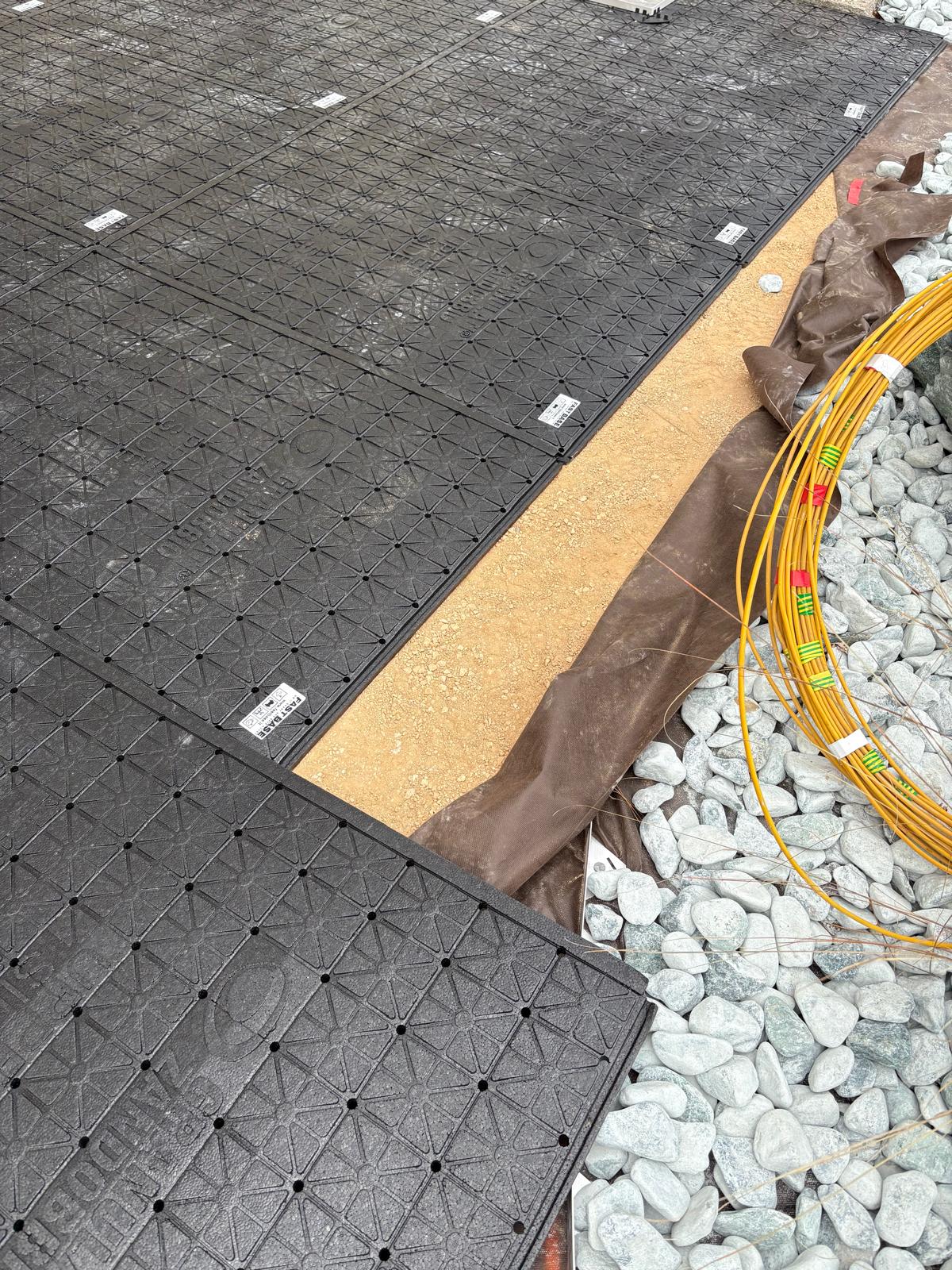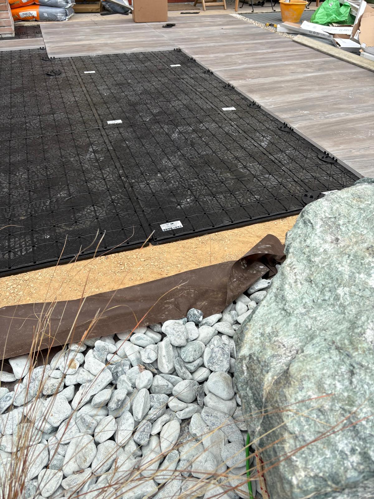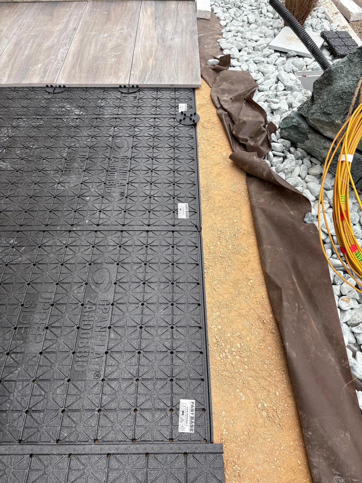 FAST BASE a réduit les travaux de terrassement et a permis de travailler facilement même sur des sols irréguliers. La pose est devenue simple, régulière et rapide, avec un alignement précis sur toute la surface du patio. La planéité obtenue a amélioré le confort et l’esthétique de l’espace extérieur.